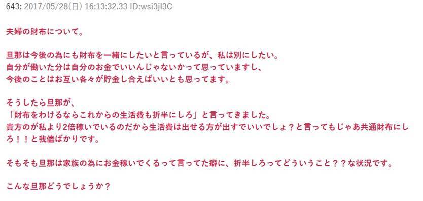 旦那は今後の為にも財布を一緒にしたいと言っているが、私は別にしたい。そう言うと「財布をわけるならこれからの生活費も折半にしろ」と言ってきたんだが・・・