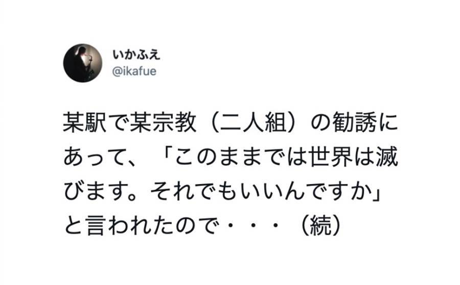 「このままでは世界は滅びる」と宗教の勧誘をされた男性。→これに対する返しが強すぎた・・(笑)