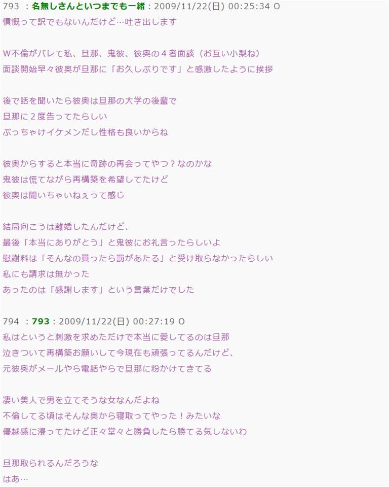 W不倫がバレて私、旦那、鬼彼、彼奥の4者面談。面談開始早々彼奥が旦那に「お久しぶりです」と感激したように挨拶した。彼奥は旦那の大学の後輩で、旦那を好きだったらしい…