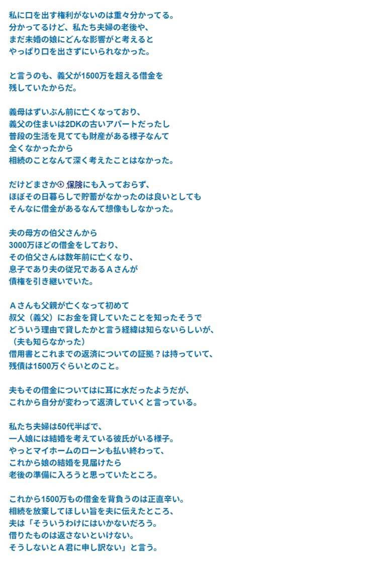 義父が、1500万を超える借金を残して亡くなった。旦那「俺が返済していく」私「相続放棄してよ!」旦那「だったらリコンだ。俺一人で返していくから、それでいいんだろ!?」→結果…..