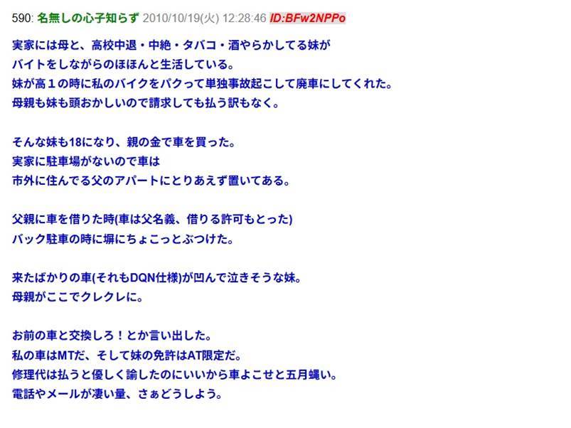 【毒親】妹の車を借りた時、塀にぶつけてしまい、妹が凹んで泣きそうになっていたので…私「修理代出すね」母「そんなものいいから、お前の乗ってる車すぐに寄越せ!!」