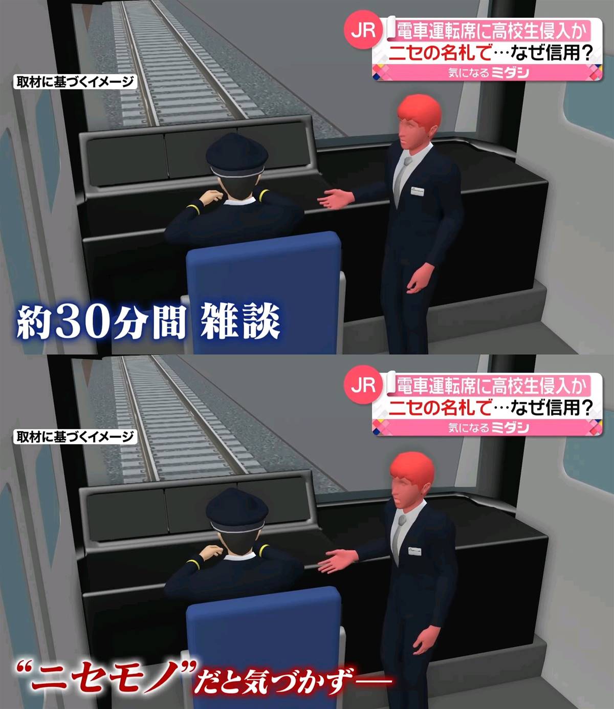 運転士はニセモノと気づかず、高校生を運転席に同乗させそのまま30分間にわたり電車について雑談をしたが、知識量が凄まじくバレず。その後味を占めて別の電車にも乗ろうとしたため発覚。
