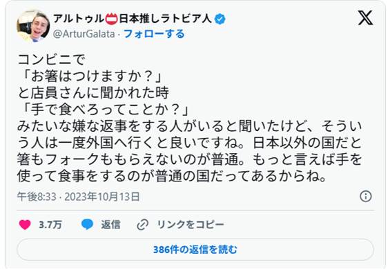 コンビニで「お箸つけますか?」に対して「手で食べろってことか?」と答える客に一喝する外国人